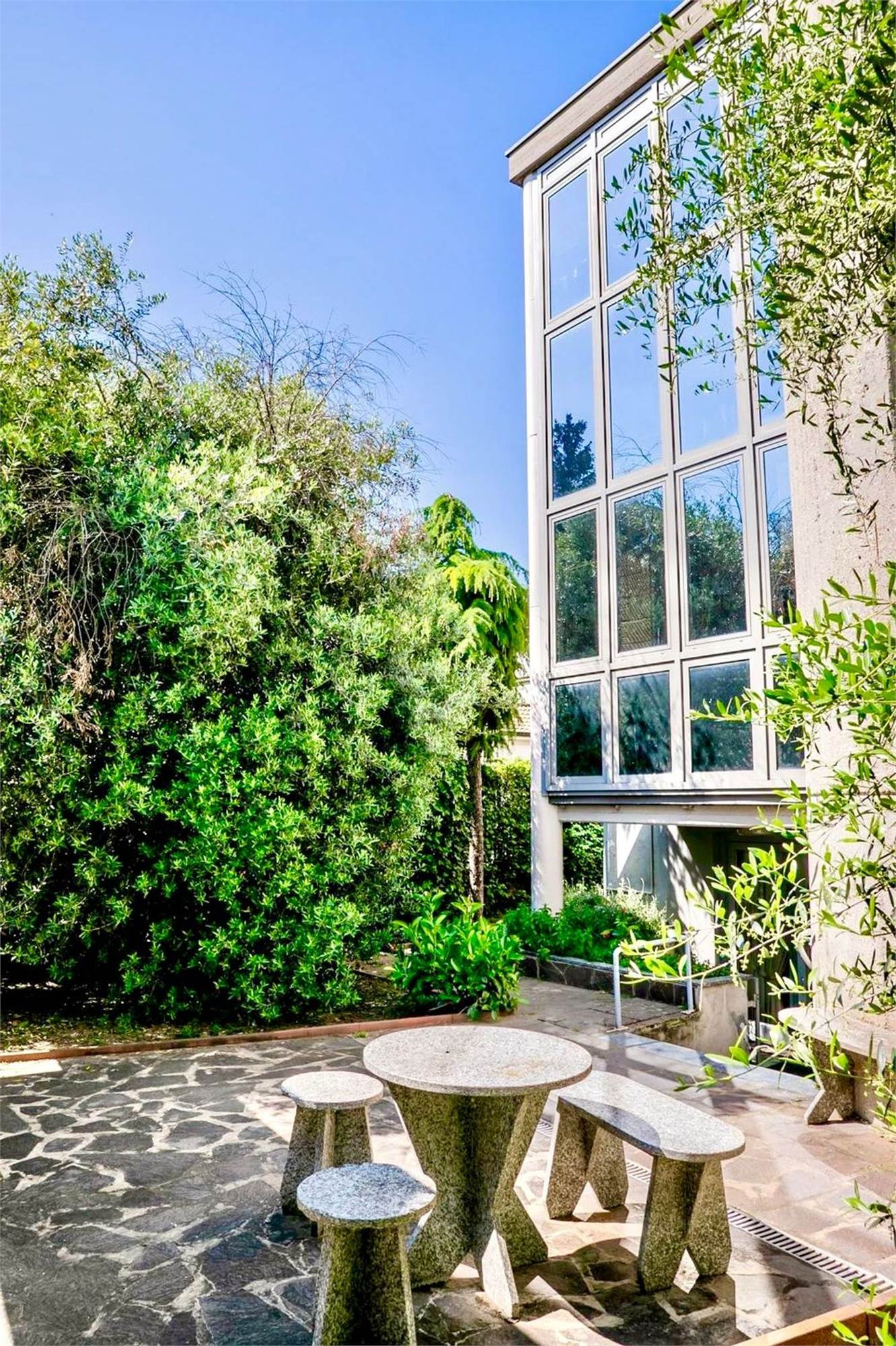 Il piano rialzato accoglie con un luminoso living open space, una sala da pranzo adiacente e una cucina abitabile con affaccio sul giardino interno, ambiente ideale per vivere momenti di convivialità nella massima riservatezza.
