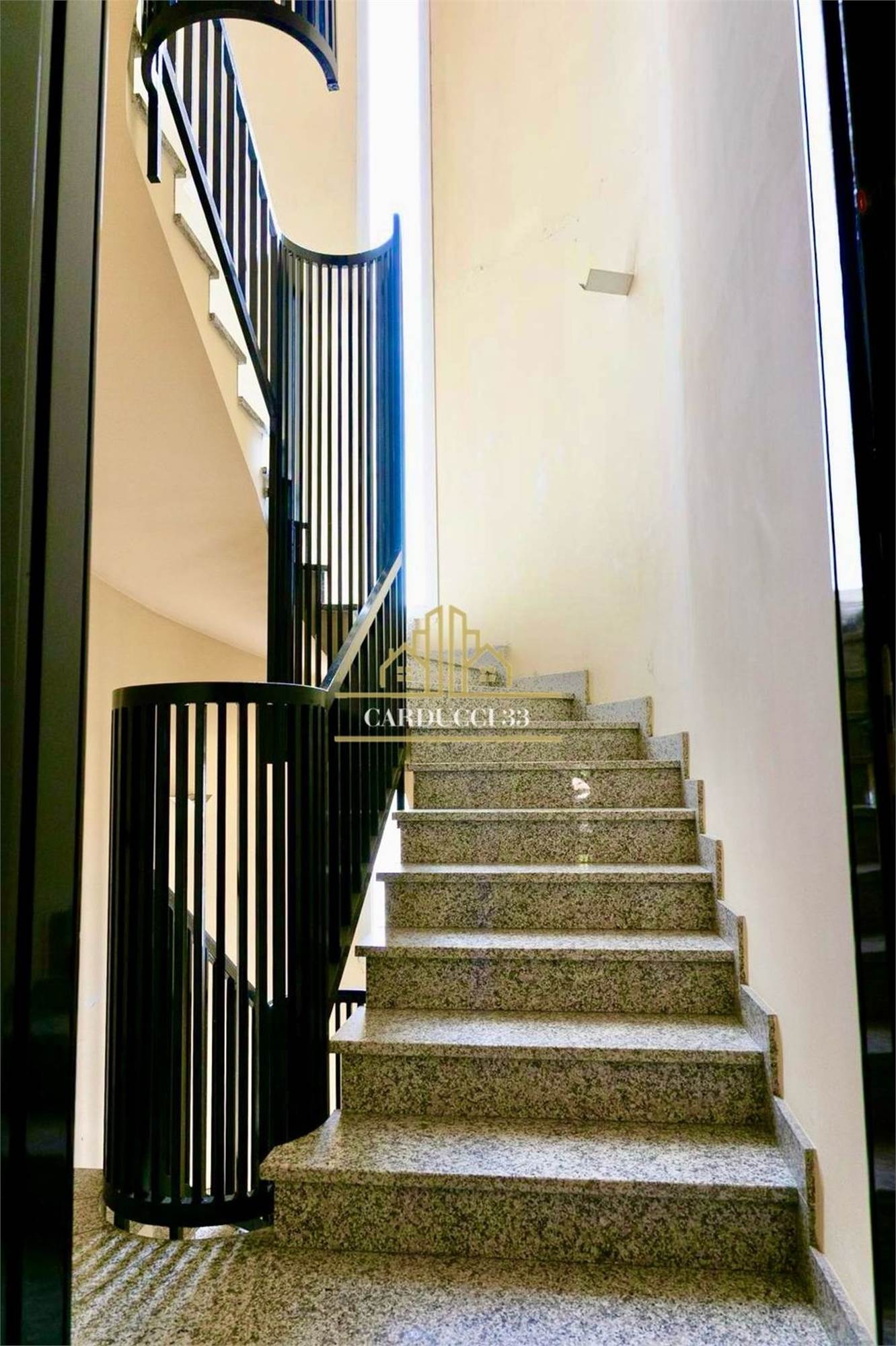 Al primo piano, collegato da un’elegante scala in granito circolare, si trovano tre camere da letto, un bagno con doccia e un ampio terrazzo con vista sulla storica chiesa dei Padri Barnabiti.
